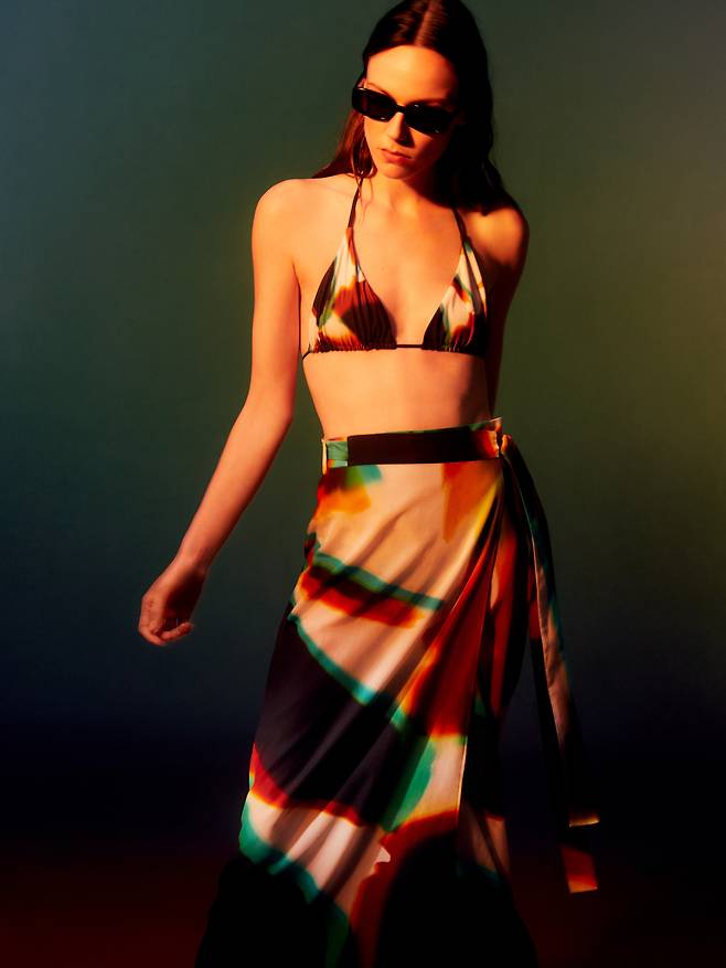 작년, 목정욱과 함께한 협업을 뒤로하고 포토 그래퍼 레아 콜롬보와 만났다. 화려하고 독특한 분위기를 자아내는 그의 작업물 중 플라워 시리즈 일부가 코스의 옷 속에 수놓아진 것. 특히 이번 컬렉션 중 스윔웨어는 끊임없이 재사용할 수 있는 친환경 소재, 에코닐을 사용해 만들어 더욱 의미가 깊다. 인화지 위에 꽃을 겹쳐 놓은 뒤 빛에 노출시키는 작업을 통해 프린트를 만들었으며, 일렁이는 네온 그래픽이 감각적인 무드를 더한다. 비키니 셋업으로 입어도 좋지만, 맥시한 랩스커트를 함께 매치하면 리얼웨이에서도 활용해 볼 법한 비치 스타일링을 완성할 수 있다.