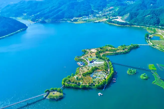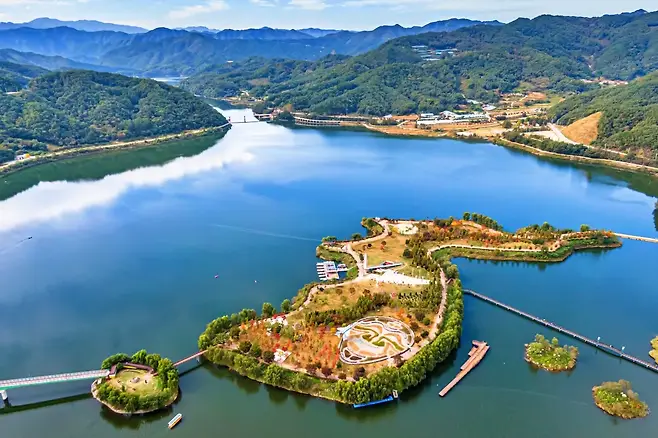 드론으로 내려다보면 물결 위에 초록색 한반도가 펼쳐진다. 섬 주변을 감싸는 3.2 ㎞ 데크길은 유모차도 거뜬한 완만한 코스라 가족 단위 방문객에게 인기가 높다. 해 질 무렵에는 ‘스파클링 한반도섬’ 사업으로 설치될 야간 경관조명이 시범 점등을 시작해, 호수 수면이 별빛처럼 반짝인다.