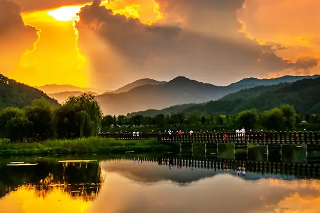 호수 서안 언덕 위 동수리 전망대는 한반도섬 전체 윤곽을 가장 선명히 조망할 수 있는 포인트다. 봄철에는 활짝 핀 버드나무와 철쭉이 호수 색과 대비돼 인생 사진을 남기기에 제격이다. 전망대 뒤편 ‘평화빌리지’ 조성 공사가 진행 중이며, 전통 한옥 숙박동과 로컬 공방이 2027년 순차 오픈한다.
