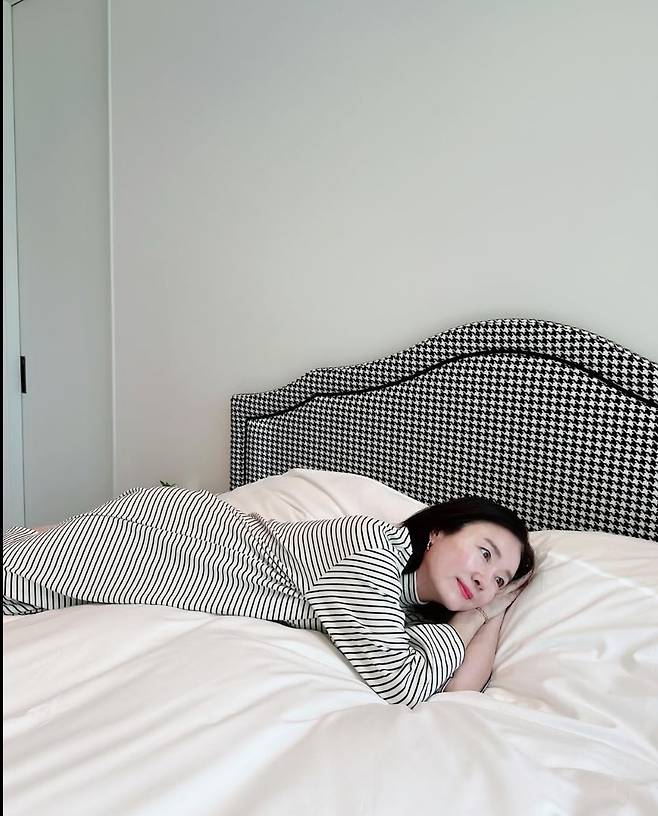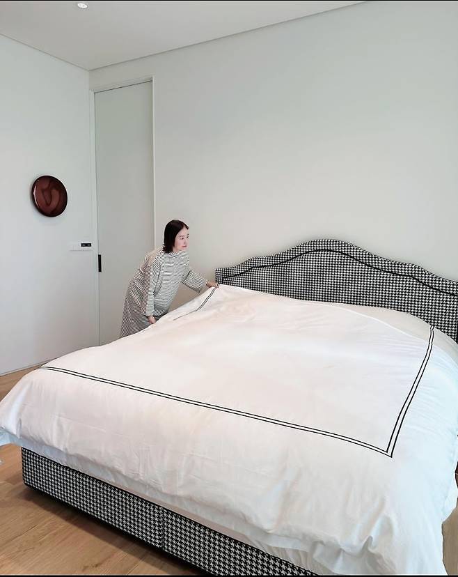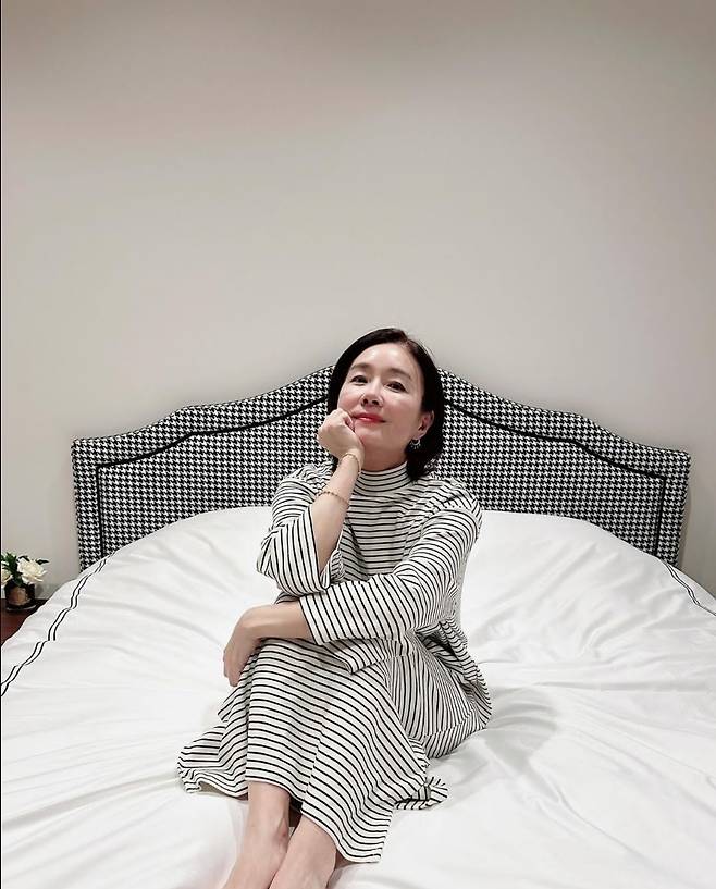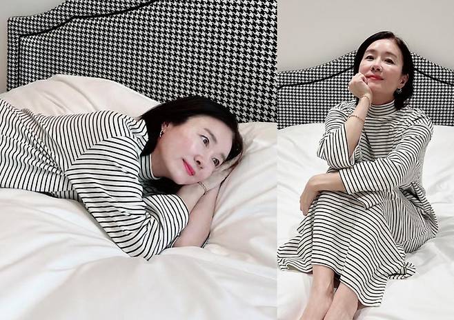 오연수는 스트라이프 원피스를 착용해 하운드 체크 패턴의 침구와 잘 어울리는 센스 있고 우아한 스타일을 뽐냈습니다.