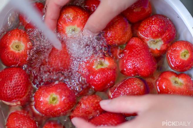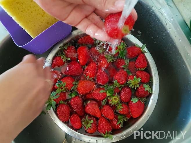 딸기를 씻을 때 가장 많이 하는 실수가 꼭지를 먼저 떼는 것이다. 꼭지를 먼저 제거하면 그 자리로 비타민C가 물에 녹아 빠져나간다. 동시에 물속 불순물이나 세균이 딸기 속으로 들어갈 수 있다. 꼭지는 씻는 동안 보호막 역할을 한다. 먹기 직전에 떼는게 좋다.