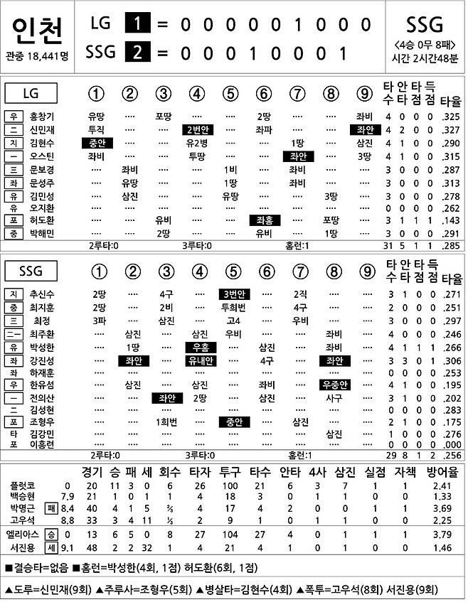 [2023 KBO리그 기록실] LG vs SSG (8월 20일)