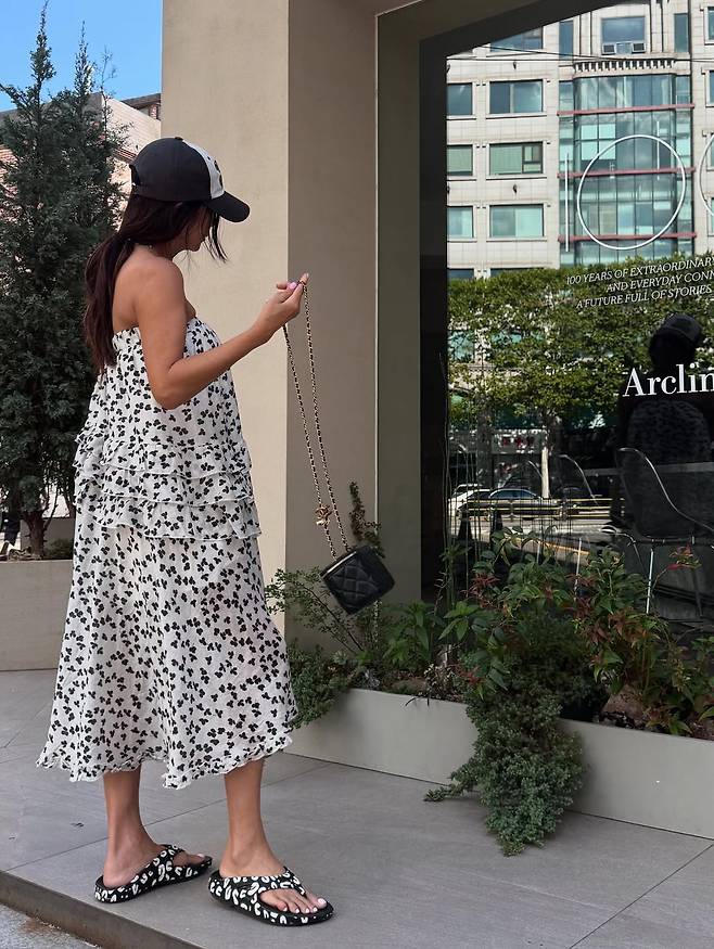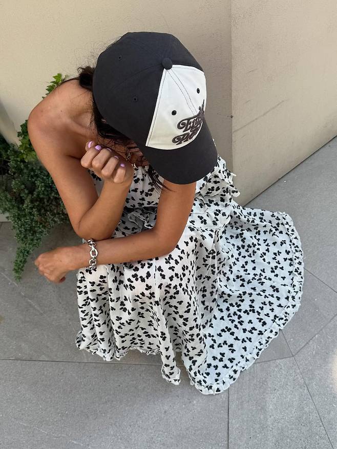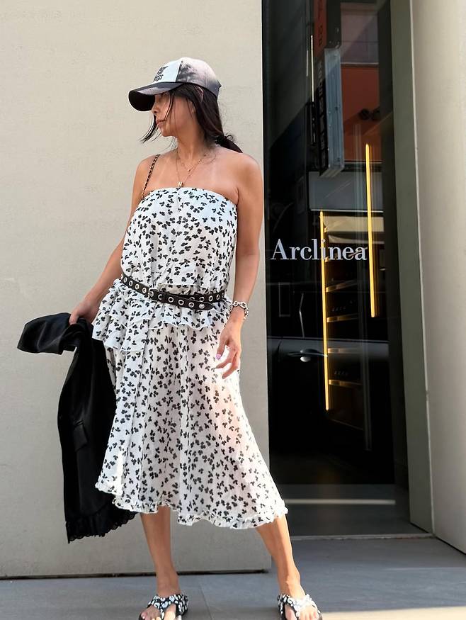 여성스러운 패턴의 의상에 펑키한 스터드 벨트와 스포티한 볼캡을 믹스매치해 독보적인 ‘황신혜표’ 스타일을 완성했다.