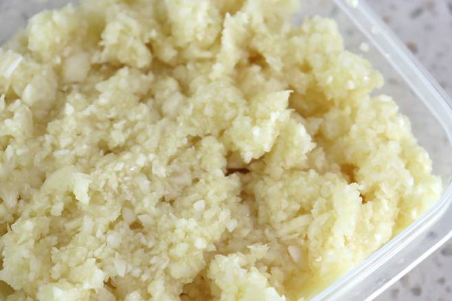 * 마늘을 다질 때 양파 한 조각을 함께 넣어 같이 다지거나 갈아주면 갈변을 막을 수 있어요. 비율은 마늘 9에 양파 1 정도가 적당해요