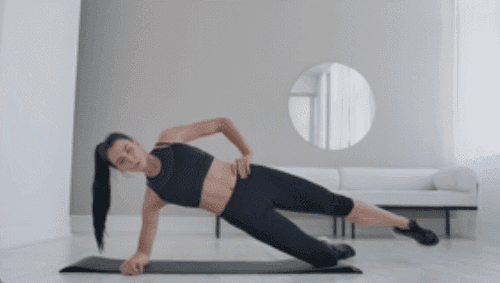 오른쪽 팔뚝을 바닥에 대고 옆으로 누워 왼손은 옆구리에 둔 상태에서 준비합니다. 왼쪽 다리를 곧게 들어 올렸다가 내리는 동작을 반복합니다. 이어서 왼쪽 팔뚝을 대고 반대쪽으로 누워 오른쪽 다리를 같은 방식으로 들어 올립니다.