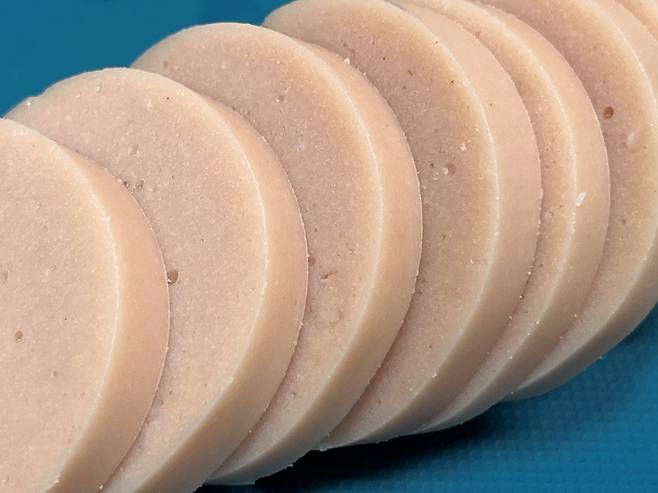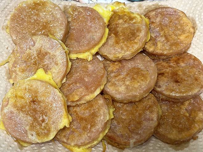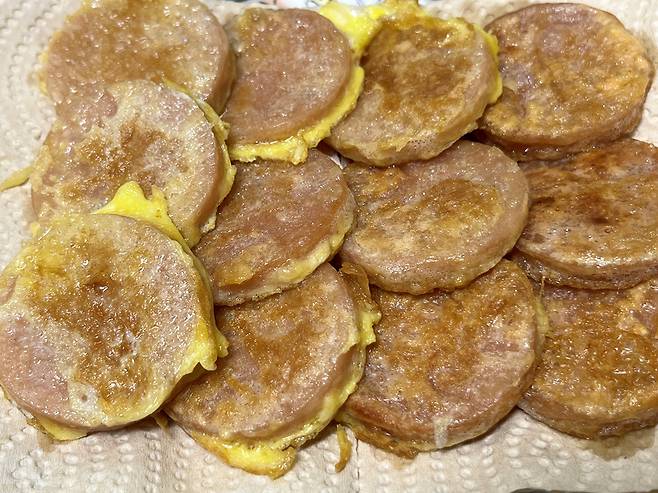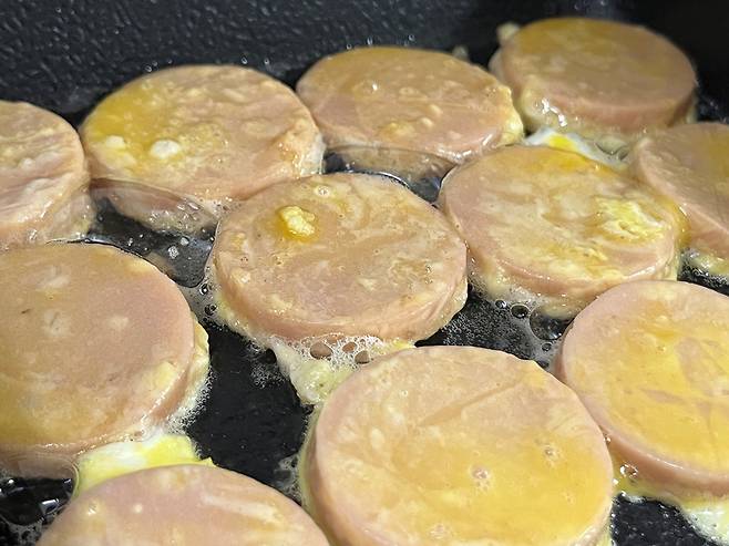 분홍소시지는 껍질을 벗긴 뒤 살짝 도톰하게 자릅니다. 소시지를 너무 얇게 자르면 식감도 잘 느껴지지 않고 너무 금방 타버립니다.