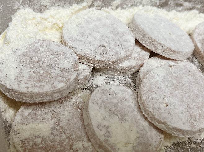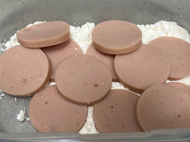밀폐용기 뚜껑을 닫고 마구 흔들면 이렇게 소시지에 부침가루가 골고루 묻습니다. 그냥 계란만 묻혀서 부치는 것보다 이렇게 부침가루를 묻히면 겉이 바삭해지고 고소한 풍미가 더해집니다.