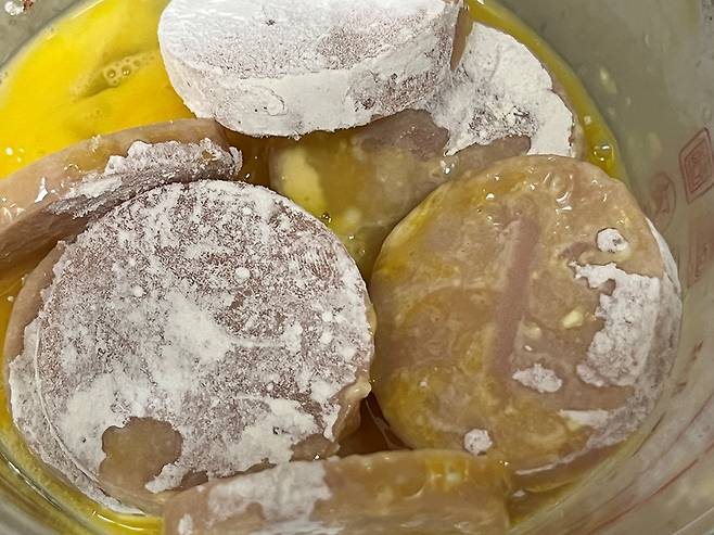 부침가루 묻힌 소시지는 다시 계란물에 넣어 계란 옷을 입힙니다.