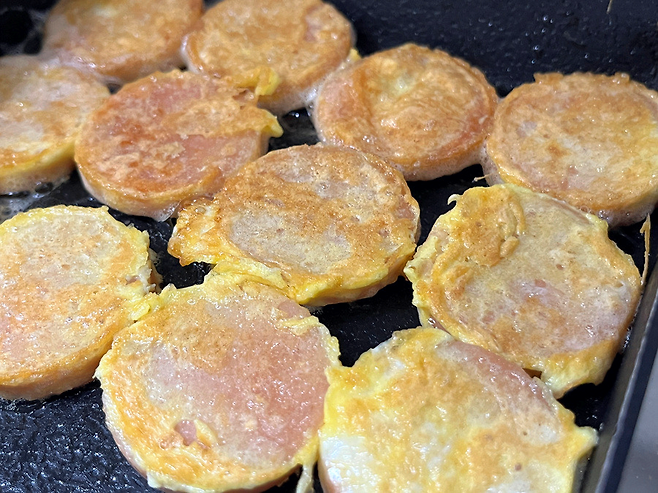 바닥면에 노릇하게 익으면 뒤집어서 반대 부분도 익혀 주세요. 식용유가 부족하면 겉면이 쉽게 탈 수 있으니 기름의 양을 계속 확인해 주세요.