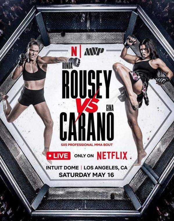 론다 로우지가 돌아온다. 그것도 지나 카라노와 붙는다. 이름만 놓고 보면 여성 격투기 역사책에서 튀어나온 매치업이다. 실제로 주최사 MVP(모스트 밸류어블 프로모션)는 이 경기를 “프로 MMA를 넷플릭스로 가져오는 첫 이벤트”의 메인이벤트로 걸었다. 날짜는 2026년 5월 16일, 장소는 미국 LA 인튜이트 돔, 넷플릭스가 전 세계 생중계다.
