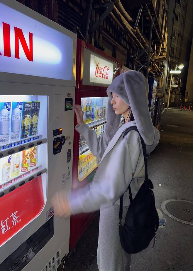 또 여기에 커다란 귀가 달린 퍼 토끼모자를 매치해, 평소의 도도한 이미지와는 180도 다른 귀엽고 자유분방한 매력을 발산했다.