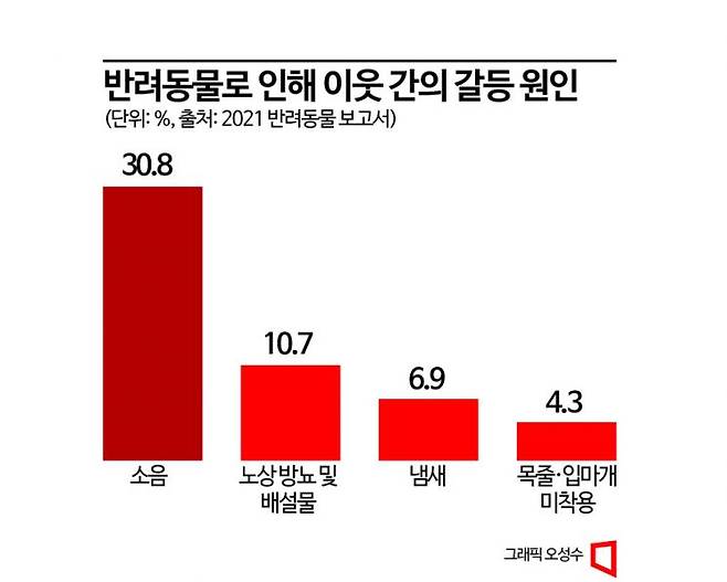 '2021 반려동물 보고서'에 따르면 반려인 56.9%가 반려동물을 기르면서 이웃과 분쟁을 경험한 적이 있다고 답했다. 소음이 30.8%로 1위를 차지했고 ▲노상 방뇨 및 배설물(10.7%) ▲냄새(6.9%) ▲목줄·입마개 미착용(4.3%)이 뒤를 이었다.