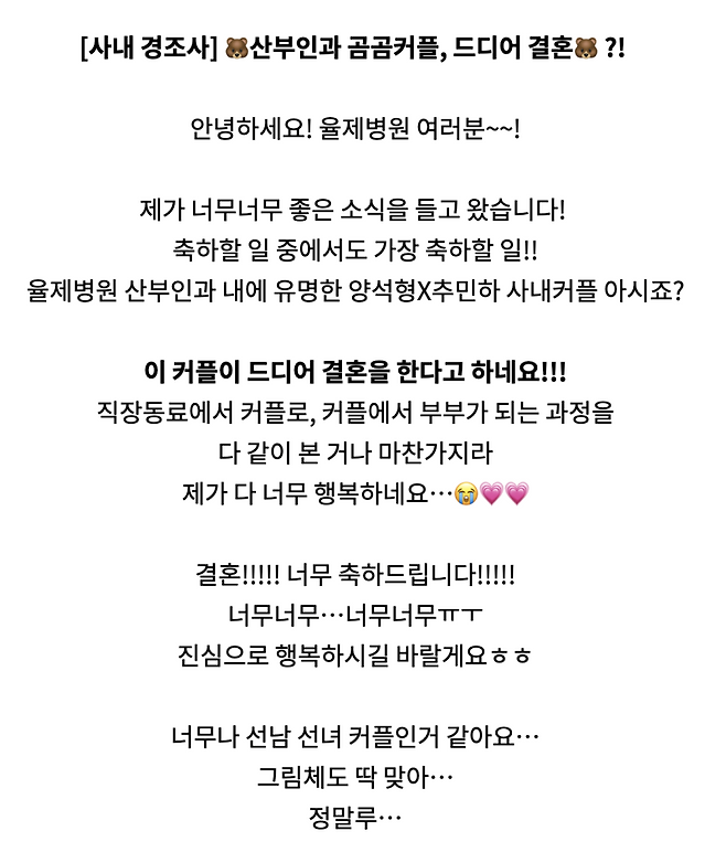 슬기로운 의사생활 덕후들 소리 질러!!! 꺅! 다들 곰곰커플 기억하시죠? 양석형이랑 추민하 말이에요! 🐻❤️🐻 아니 글쎄, 드디어 결혼 소식을 율제병원 홈페이지에 뙇! 알렸다는 거 아니겠어요?! 드라마 끝난 지 꽤 됐는데도 아직까지 곰곰커플 앓이 하던 사람들, 완전 희소식!!!
