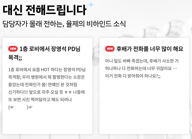5월에 공개될 슬의생 스핀오프 ‘언젠가는 슬기로울 전공의 생활’ (언슬전) 시작하면서 공식 SNS에 율제병원 가상 홈페이지 링크가 올라왔는데, 거기에 완전 깜짝 놀랄 소식이 숨어있었던 거 있죠! 바로바로… 사내 경조사 카테고리에 ‘산부인과 곰곰커플, 드디어 결혼?!’ 이라는 제목의 글이 올라온 거예요! 🤭