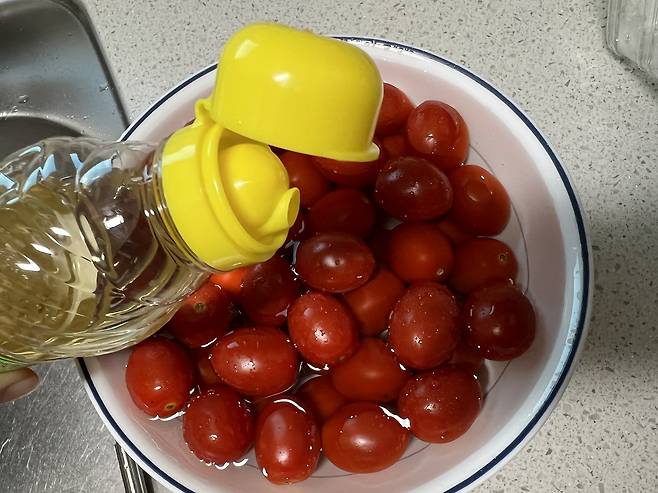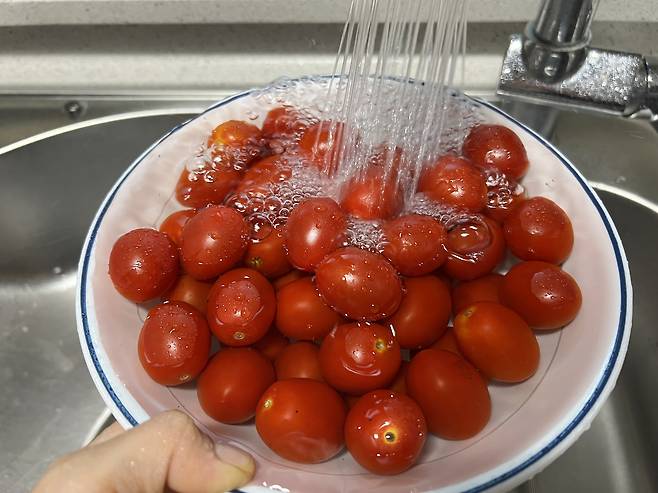 방울토마토를 꼭지 째 넣고 일단 흐르는 물에 씻으시는 분들이 대부분인데요. 꼭지부터 제거하는 게 원칙입니다. 꼭지가 있는 상태로 세척하면 꼭지 때문에 토마토에 상처가 생길 수 있기 때문이에요. 또 보관할 때도 꼭지부터 곰팡이가 생기기 쉬우니 꼭지를 제거하고 보관하는 게 좋습니다.