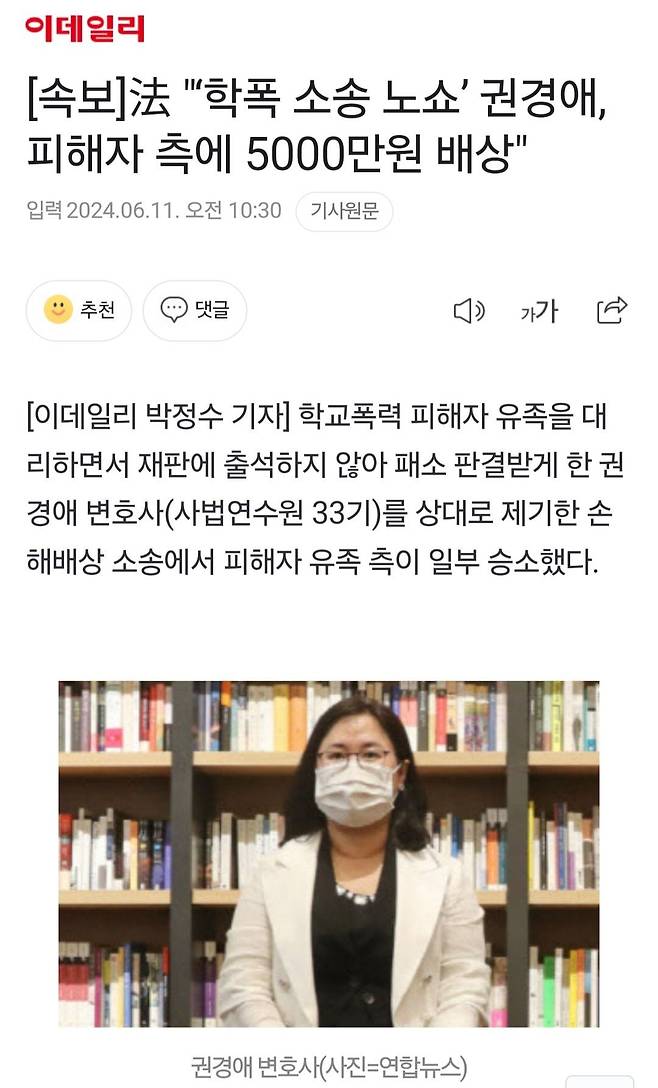 [속보]法 "‘학폭 소송 노쇼’ 권경애, 피해자 측에 5000만원 배상"