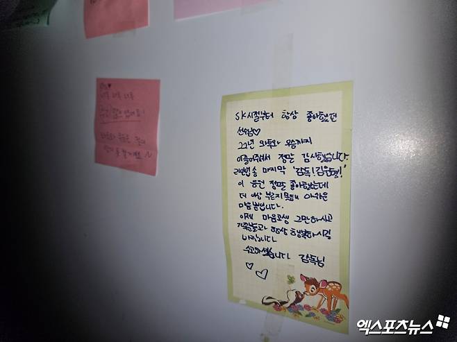 와이번스의 기억을 잊지 않고 싶었던 팬들은 이곳에도 많은 흔적을 남겼다. 포토존 곳곳에 메모지가 붙은 가운데, 세 시즌 만에 팀을 떠나게 된 김원형 전 감독의 포토존에는 '와이어 투 와이어 우승은 잊지 못할 거예요', '더 이상 감독님의 이름을 부르지 못해 아쉽습니다' 등 팬들이 전하는 메시지가 눈길을 끈다.