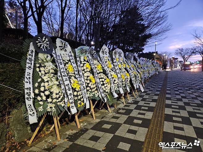 (엑스포츠뉴스 유준상 기자) 찬 바람이 불던 29일 오전 11시, SSG랜더스필드가 위치한 인천 문학경기장 북문 인근의 대로변에 수십 개의 근조화환이 도착했다.