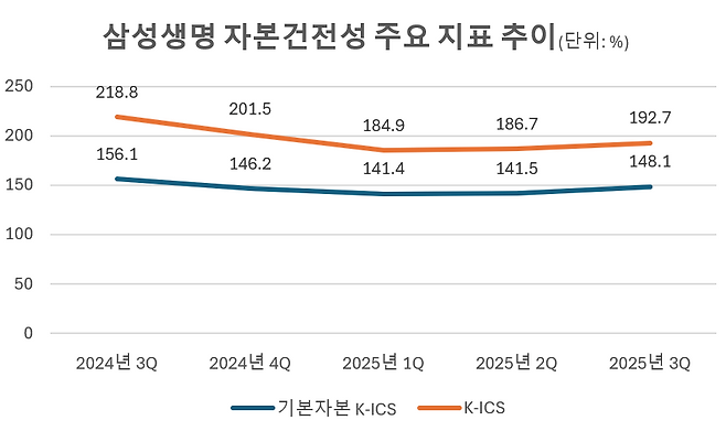 삼성생명의 자본건전성 지표인 K-ICS도 회복세다. 작년 3분기 K-ICS비율은 192.7%를 기록해 2025년 1분기(177.2%) 대비 지속적인 개선 흐름을 나타냈다. K-ICS비율은 가용자본을 요구자본으로 나눈 비율이다.