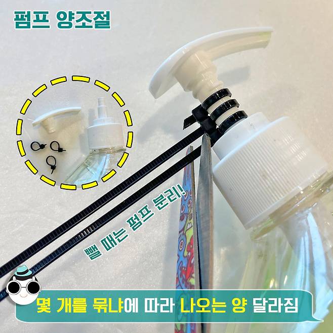 바로 펌프의 몸통 부분에 케이블타이를 감아주는 것인데요~ 몇 개를 묶냐에 따라 나오는 양을 섬세하게 조절할 수도 있어요. 밥심은 총 3개 묶어주었는데, 눌렀을 때 딱 적당하게 나오는 모습을 확인할 수 있네요~