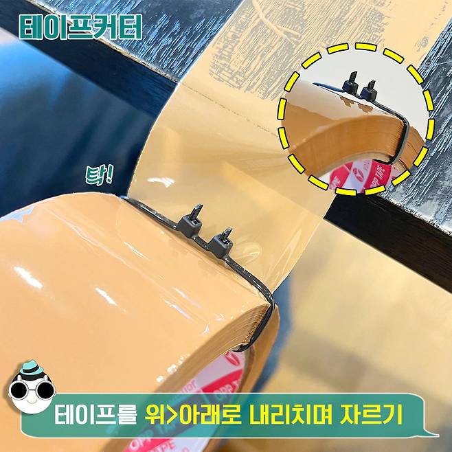 매번 박스테이프를 사용할 때마다 가위 찾기 번거로우셨죠? 테이프 자르려고 대충 고정해놓고 나서 가위 찾으러 갔다 오면 전부 풀려 있음..^^ 게다가 외부에서 테이프를 사용할 때 가위가 없으면 정말 난감해요.