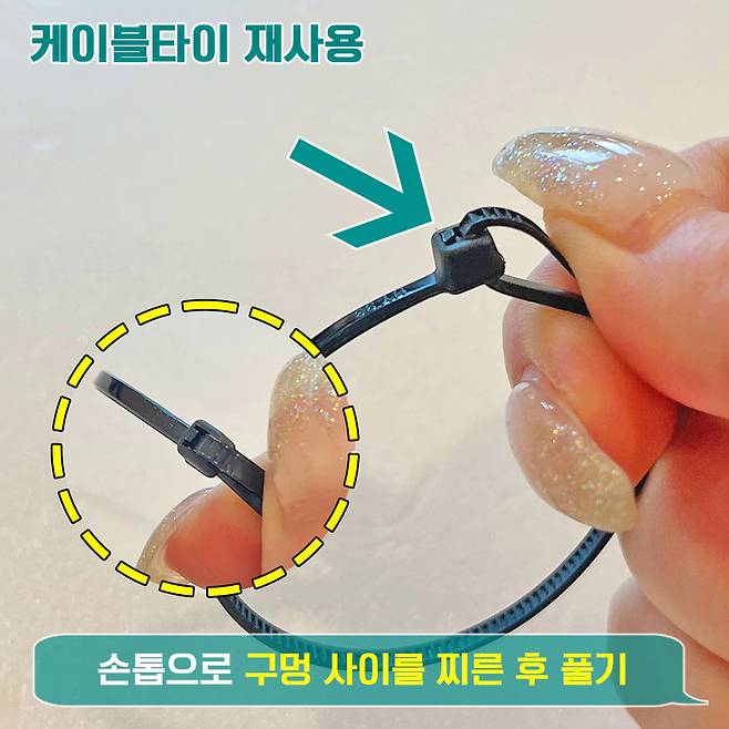 많은 여러들이 은근히 오해하고 있는 것이 있어요. 바로 케이블타이는 한 번 묶으면 가위로 자르지 않은 이상 푸르지 못한다고 생각하는 것이죠. 그러나 방법만 알면 10초만에 손쉽게 풀어지는 것이 바로 케이블타이!