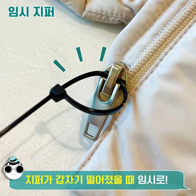 그럴 때 임시방편으로 케이블타이를 구매해 사용해보세요. 지퍼 구멍에 케이블 타이를 넣어서 손잡이를 만들어주고 선을 정리해주면 끝! 손톱으로 지퍼를 움직이지 않아도 돼서 정말 간편한 것 같아요~