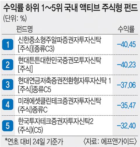 가장 부진한 성적을 낸 펀드는 신한자산운용의 ‘신한중소형주알파증권자투자신탁’으로 연초 이후 40.45% 하락하며 시장 수익률을 한참 밑돌았다. 이 펀드는 코스닥 중·소형주에 집중 투자하고 펀드매니저 판단에 따라 일부 대형주에 투자하는 상품이다. 코스닥이 주요국 증시에서 가장 부진한 성적을 낸 데다, 펀드매니저 판단으로 한때 가장 높은 편입 비중을 차지했던 삼성전자도 고꾸라지면서 수익을 내기 어려웠던 것으로 풀이된다.