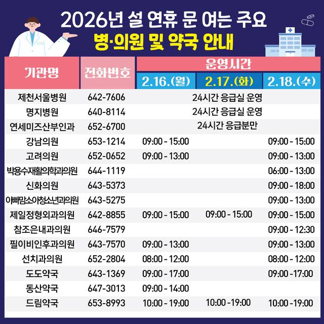 제천시보건소는 설 연휴 기간 비상진료반을 편성해 운영하며 지정 의료기관에 대한 현장 점검과 안내를 강화할 방침이다.