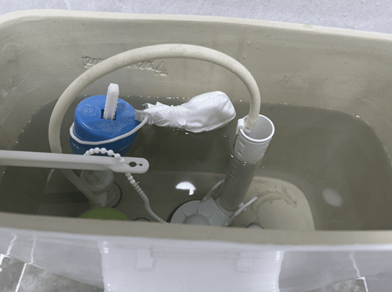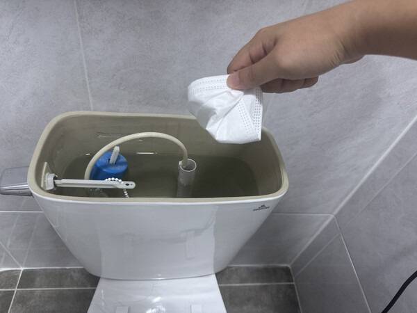 완성된 마스크 세정제를 변기탱크 안에 걸거나, 변기통 안 물이 잠기는 부분에 넣어 고정합니다.