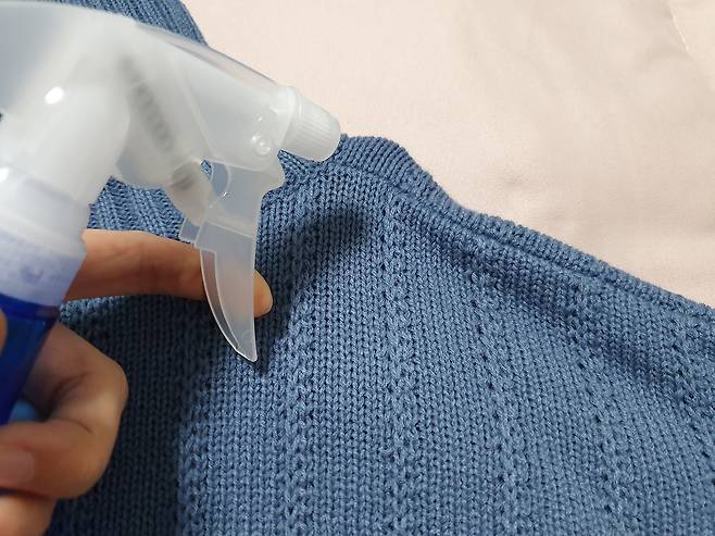 옷걸이 자국으로 튀어나온 곳에 촉촉하다 생각할 만큼 뿌려주세요. 만약 분무기가 없다면 손에 물을 묻혀 닦아주셔도 돼요.