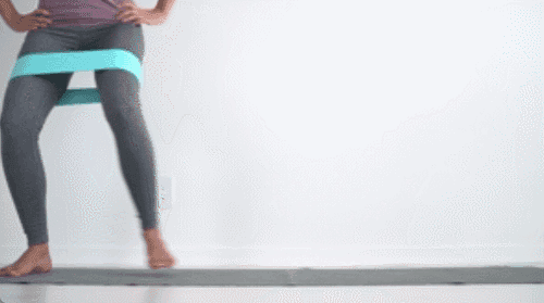 매트 위에 서서 허벅지 사이에 밴드를 착용한 상태에서 무릎을 살짝 구부립니다. 양손은 옆구리에 두고, 왼쪽 다리를 옆으로 벌리며 사이드 워크 동작을 합니다. 이어서 오른쪽 다리를 옆으로 이동하며 같은 방식으로 반복합니다.