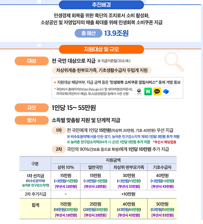 정부가 2025년 7월 21일부터 전국민을 대상으로 '민생회복 소비쿠폰'이 지급된다고 발표했습니다. 부산시민들도 이 혜택을 받을 수 있으며, 특히 부산은 비수도권 지역으로 추가 지원금까지 받을 수 있어 더욱 유리합니다.