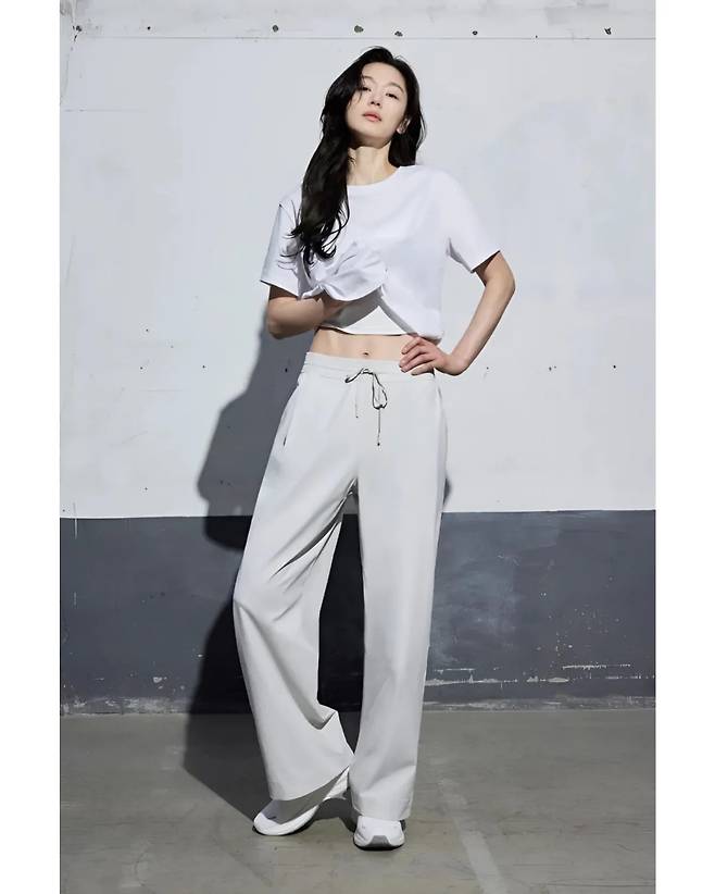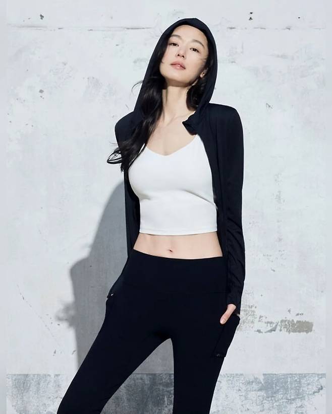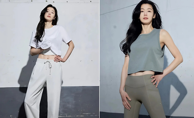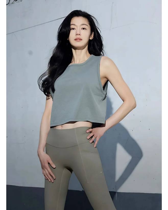 전지현은 올리브 그린 컬러의 크롭 탱크톱과 베이지 톤의 레깅스를 매치해 세련된 애슬레저 룩을 연출하고 있다. 미니멀한 디자인의 상의와 하의의 톤온톤 컬러 조합이 차분하면서도 모던한 분위기를 자아내며, 긴 웨이브 헤어가 스포티한 룩에 여성스러운 포인트를 더하고 있다.
