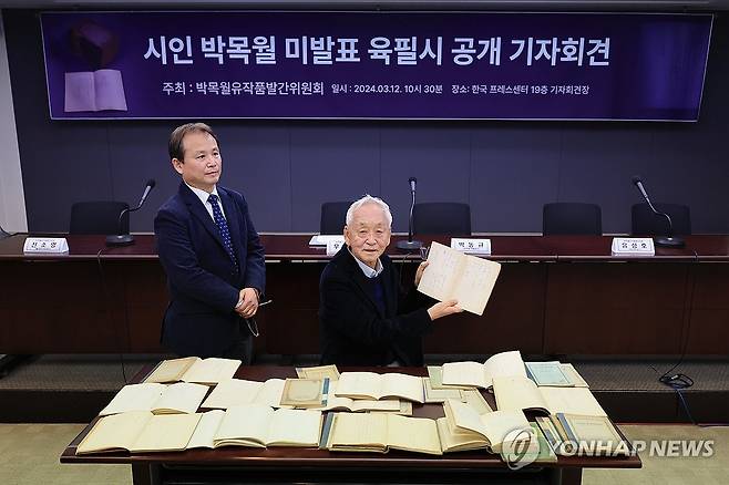 (서울=연합뉴스) 신현우 기자 = 박목월 시인 장남인 박동규 서울대학교 명예교수(오른쪽)와 우정권 단국대학교 교수가 12일 오전 서울 중구 한국프레스센터에서 박목월 시인의 미발표 육필 시를 공개하고 있다.