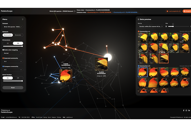 페블로스코프는 고차원 벡터 데이터 분석 및 시각화 기술을 바탕으로 방대한 AI 학습 데이터의 품질을 직관적으로 평가하고 인사이트를 도출할 수 있게 한다.