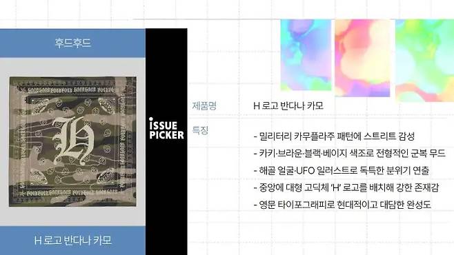 해당 제품은 밀리터리 카무플라주 패턴에 스트리트 감각을 더한 제품이다. 카키, 브라운, 블랙, 베이지가 조화를 이루며 전형적인 군복 이미지를 구현했고 중앙에는 대형 고딕체 ‘H’가 강하게 자리 잡아 시선을 사로잡는다.