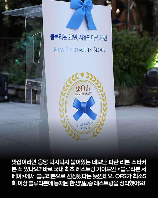 맛집이라면 응당 덕지덕지 붙어있는 네모난 파란 리본 스티커 본 적 있나요? 바로 국내 최초 레스토랑 가이드인 <블루리본 서베이>에서 블루리본으로 선정됐다는 뜻인데요.