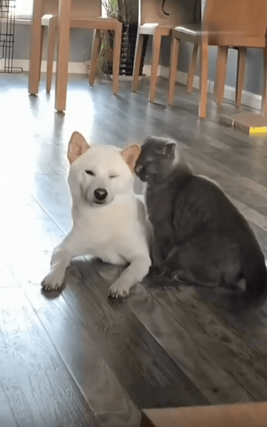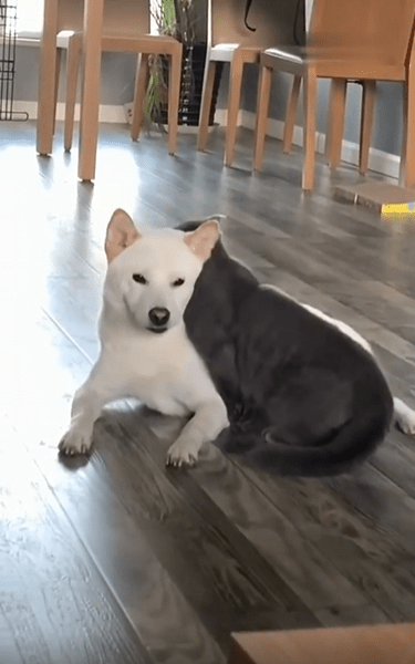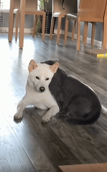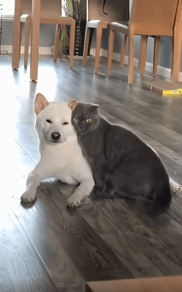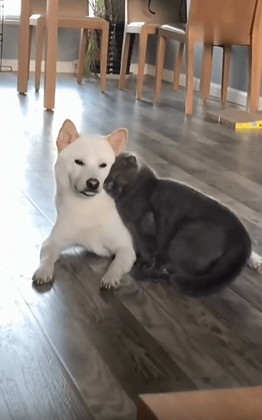 고양이는 딱히 경계를 풀었다는 표시를 하지 않지만, 그 몸짓만으로도 강아지를 향한 신뢰가 느껴집니다. 무엇보다 눈에 띄는 건, 고양이의 머리가 살짝 강아지의 어깨에 닿아 있다는 점입니다. 마치 “여기, 괜찮지?”라고 묻지도 않은 채 자연스럽게 기댄 모습이죠. 그 자세는 억지스러움이 없고, 오래된 습관처럼 익숙합니다.