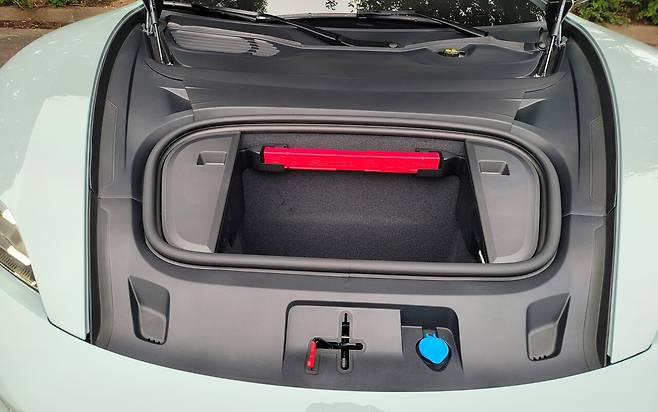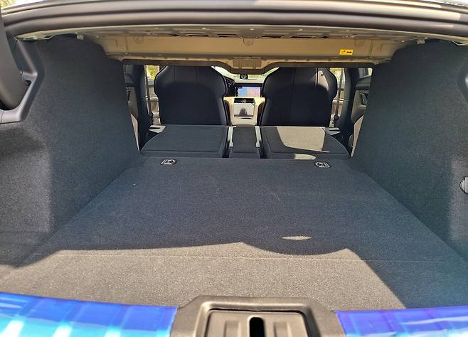 트렁크 공간은 407L이고 앞쪽(프렁크)에 84L가 있다. 뒷좌석을 접으면 더 널찍한 적재공간을 만들 수 있다.