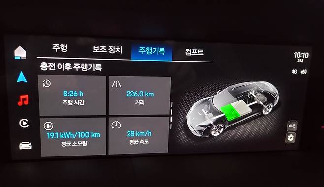 공인 전비는 복합 4.1km/kWh(도심 4.1, 고속도로 4.1)다. 적절히 드라이빙을 즐기며 일상 주행을 한 이틀간의 시승 후 최종 전비는 5.2km/kWh로 공인 전비보다 잘 나왔다.