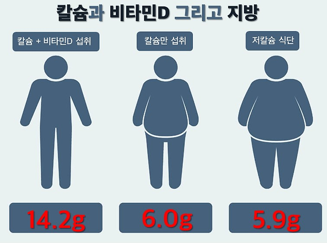 즉, 지방을 빼내기 위해서는 칼슘과 비타민D를 함께 섭취해야 한다는 결론이 나옵니다.