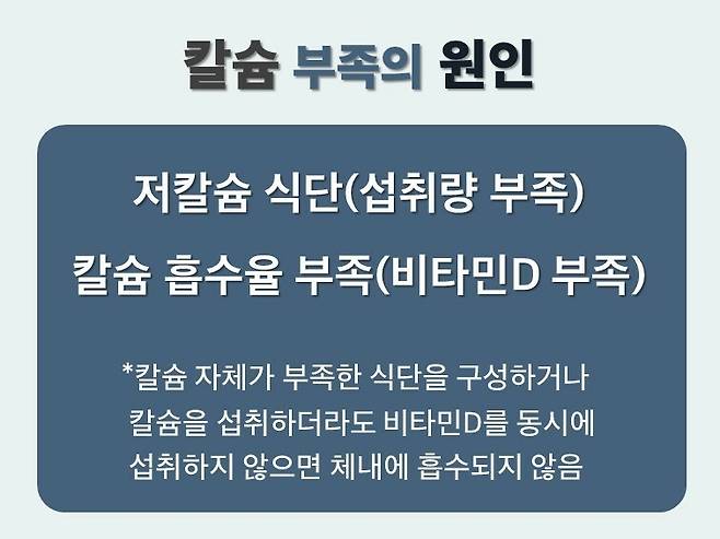 성인의 일일 칼슘 권장 섭취량은 6~700mg입니다! 그보다 적게 섭취하게 되면 골질량이 감소되어 골다공증의 주요 원인으로 발전할 수 있습니다. 또한 치아를 구성하는 주요 성분도 칼슘이기 때문에 치아 건강에도 치명적일 수 있습니다. 미세한 근육 경련과 감각 이상 등의 증상도 동반할 수 있습니다.