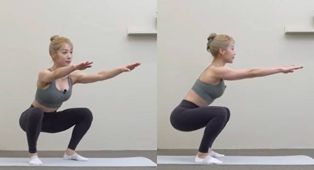 : 기본 스쿼트는 하체의 힘과 코어 근육의 안전성을 높이고 등 근육을 단련시켜준다.