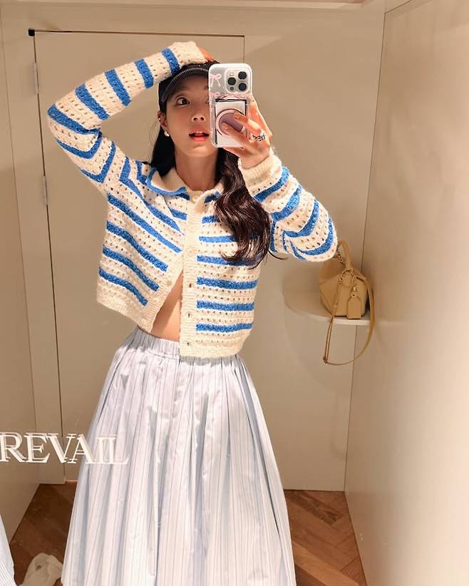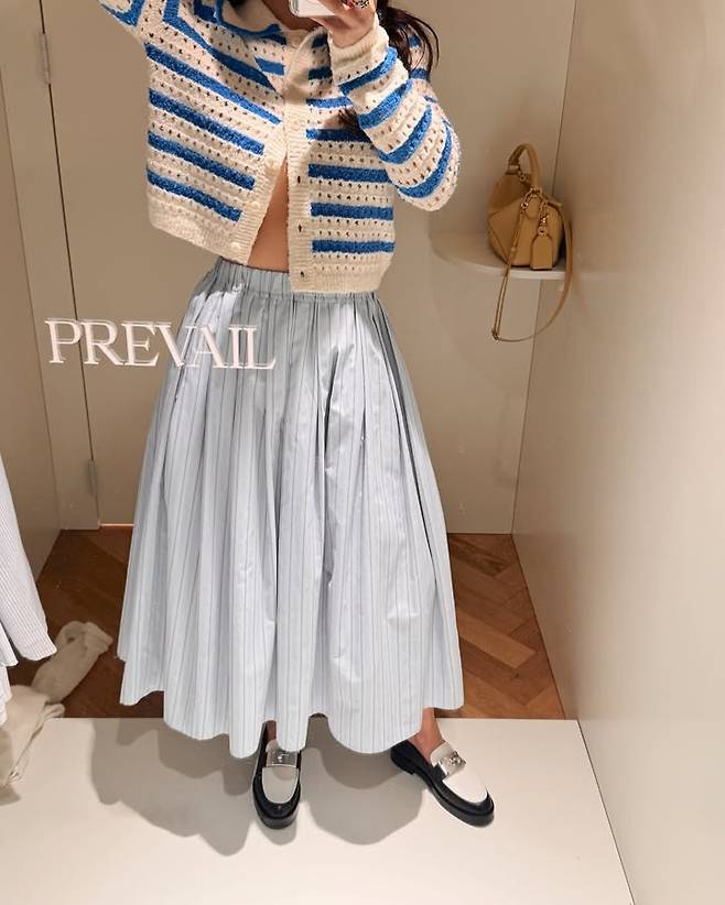 블루 스트라이프가 상큼한 크롭 니트가디건, 블루 스트라이프가 연하게 반복되는 밴딩 롱스커트 그리고,