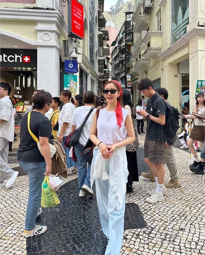 특히 블랙 슬림 선글라스와 골드 이어링, 롱 네크리스로 마무리한 액세서리 조합은 트렌디함과 여유로움을 동시에 자아냈습니다.
