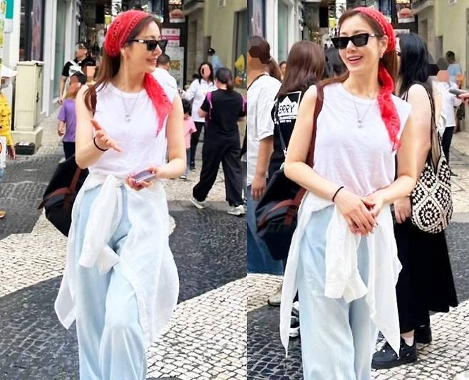 특히 포인트는 강렬한 레드 반다나로, 머리에 둘러 레트로한 무드를 완성하면서도 자연스럽게 흐르는 헤어와 함께 발랄한 매력을 발산했습니다.