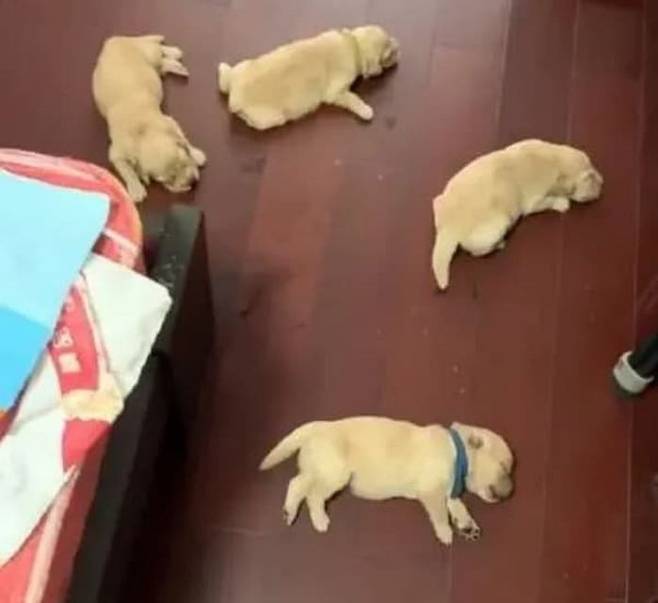 공개된 사진 속에는 정말 신기하게도 엄마와 새끼 리트리버 강아지들이 서로 약속이라도 한 듯 바닥에 누워 잠든 모습이 담겨 있었죠.