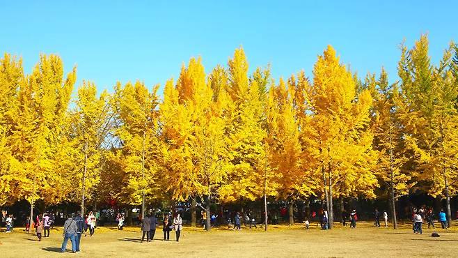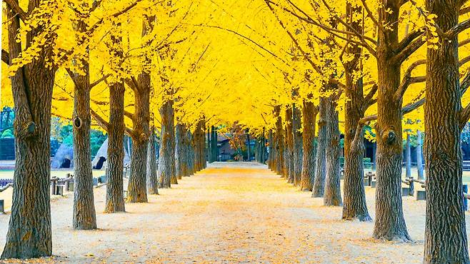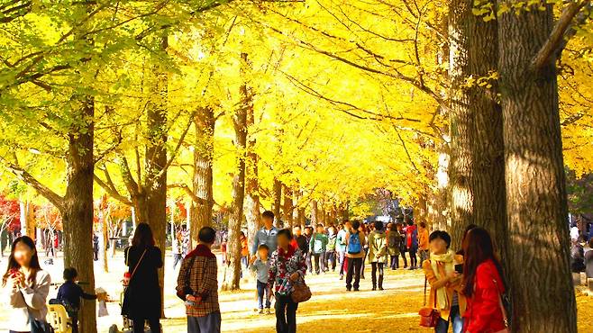 송파은행나무길 10월 말이면 하늘을 덮은 은행잎이 노랗게 물들고, 바닥엔 노란 융단이 깔린다. 걷는 것만으로도 힐링되는 이 길은 인생 사진을 남기기에 최적의 장소다.