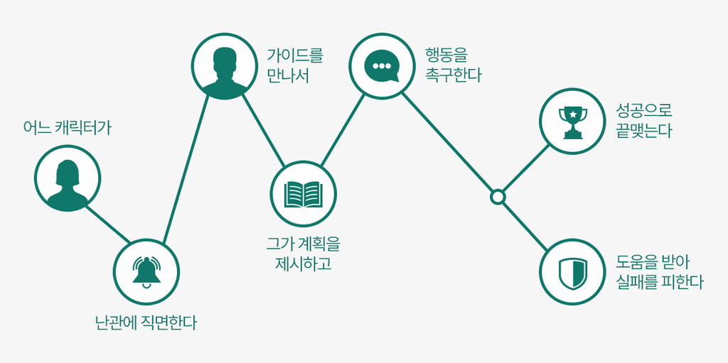 아마 대부분의 영화, 소설, 뮤지컬, 연극이 이 전개에서 크게 벗어나지 않을 텐데요. 왜냐하면 이 구조는 사람들이 가장 잘 몰입할 수 있는 스토리의 플롯 포인트거든요. 신데렐라나 해리 포터, 반지의 제왕처럼 많은 사람들에게 사랑받는 이야기를 떠올려 보세요! 주인공이 난관에 부딪히고, 도와주는 사람을 만나 실패를 피하거나 문제를 극복하고 결국 성공에 이르는 모습이 딱 떠오르죠?
